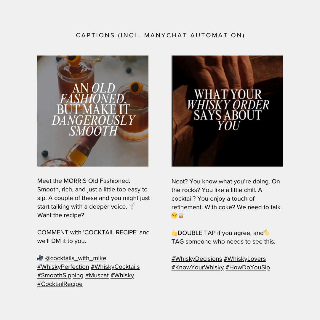 Manychat automation to trigger giveaway entries, sharing of cocktail recipes and product link click-throughs via DMs directly with customers, while “training” the algorithm that MORRIS Whisky is worth taking notice of.